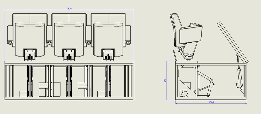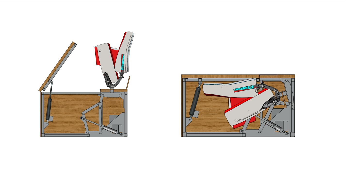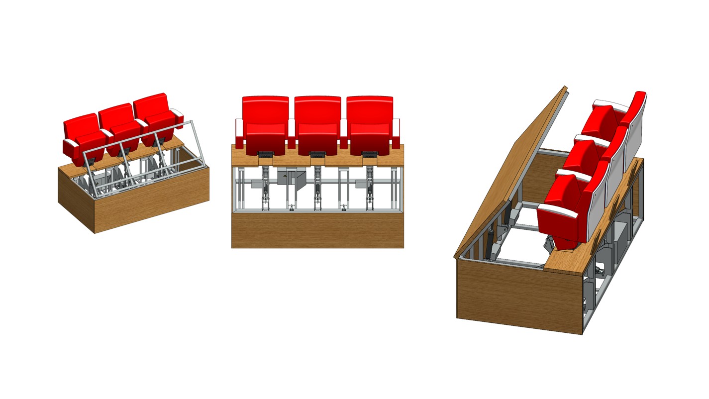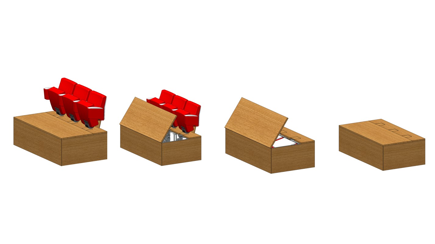 Caisson motorisé permettant de sortir ou de ranger des fauteuils, pour autoriser plusieurs configurations de salle.